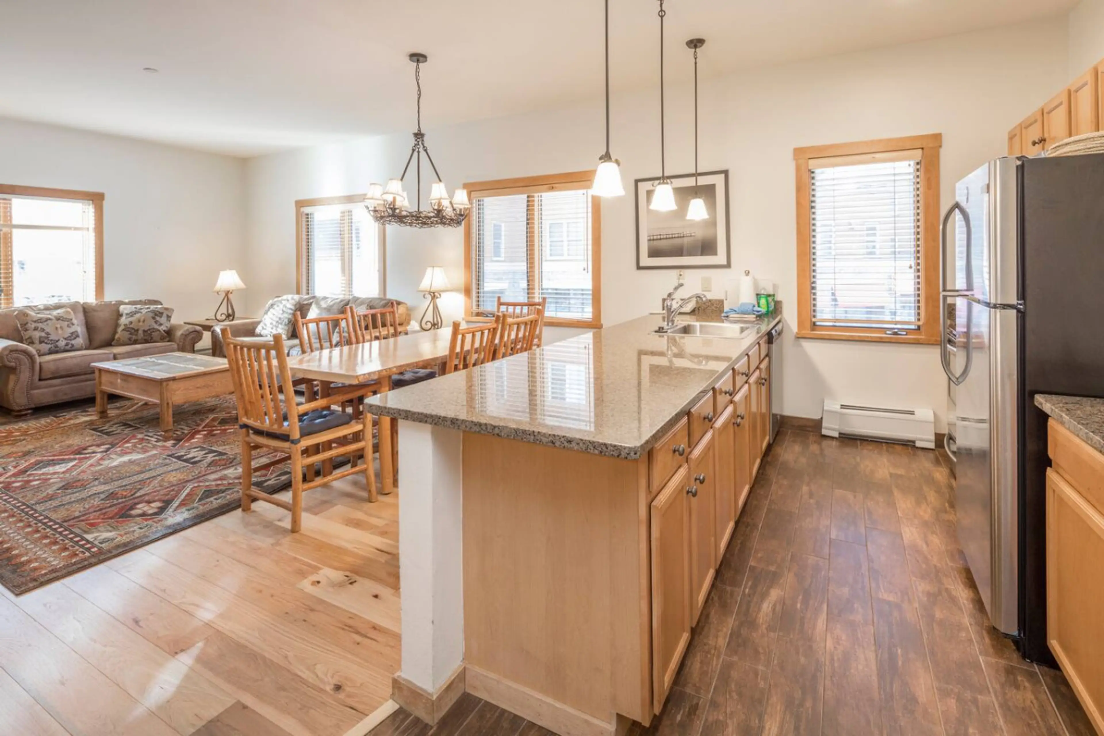 Oversized 1 bedroom and 1 bathroom with a King bed, bunk beds and a sleeper sofa. Large sunny corner unit with a very large deck and grill. Right in the middle of River Run Village and next to skiing and nightlife. Huge heated outdoor pool and hot tubs this place has it all. Updated and modern w...